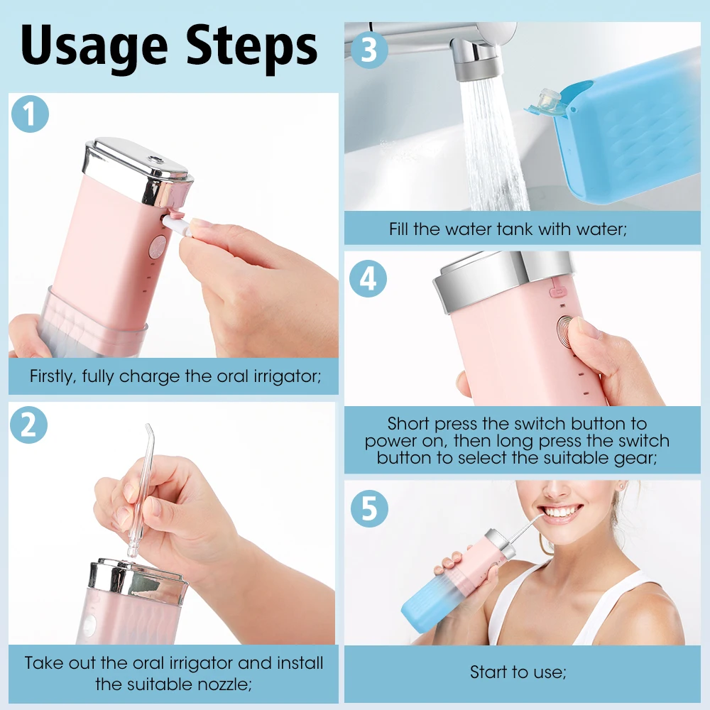 Water Tank Volume:180ml Power Type:Rechargeable Charging Voltage: 5V Rated Voltage: 3.7V Rated Power:3.5W Material:ABS,PC Color:Pale-pink,Light-blue Size:13.1x6.5x4cm Net Weight:209g Waterproof Grade:IPX7 Type:Portable Power Source:Rechargeable Battery Item Type:Oral Irrigator ..