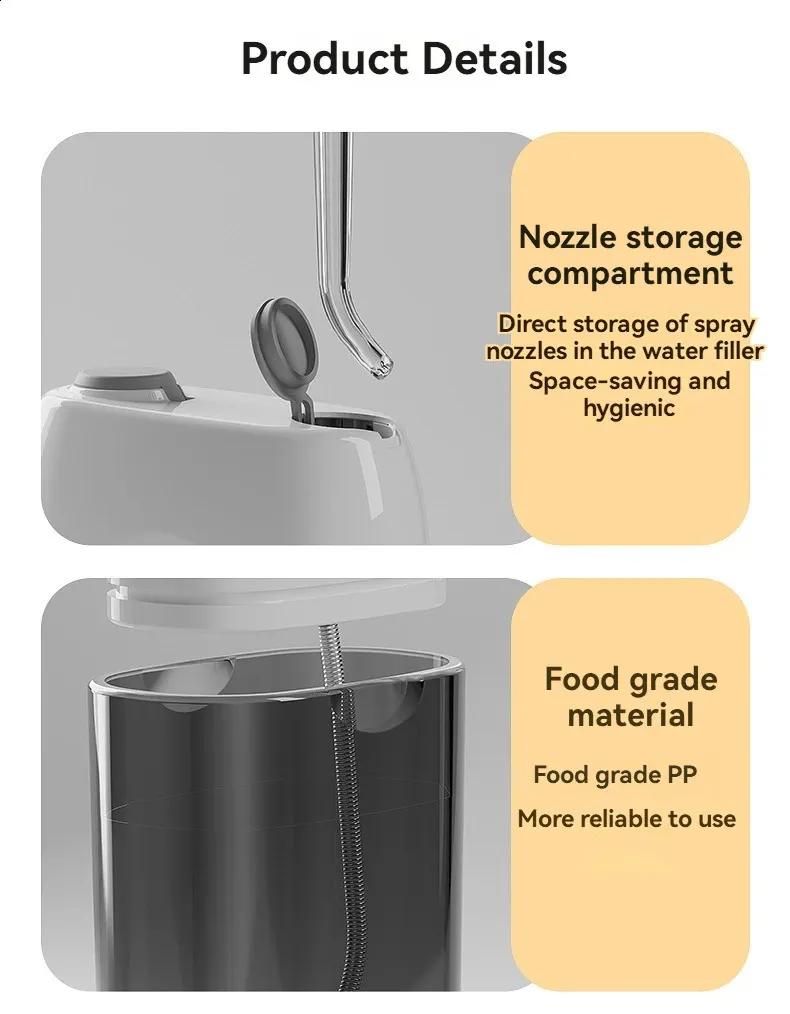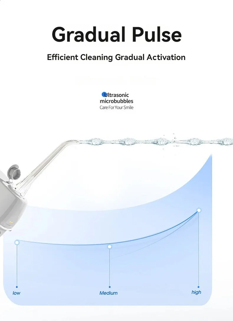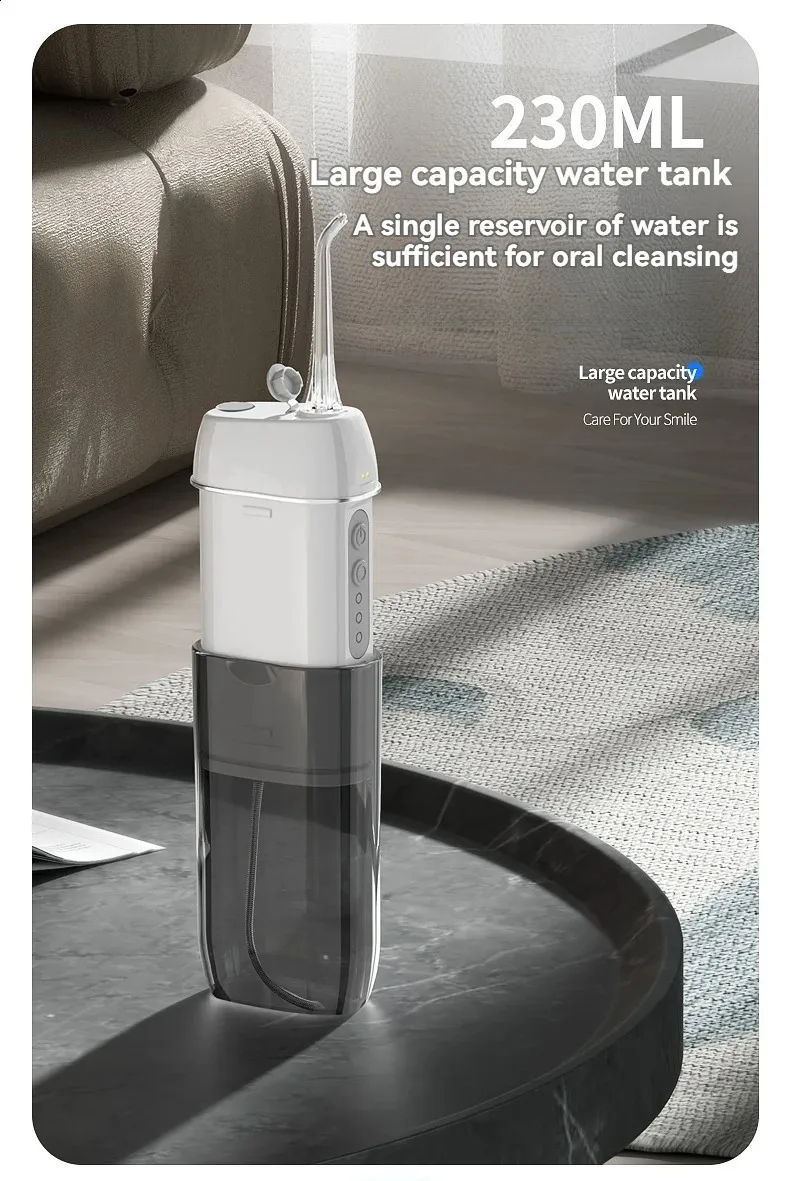 Material:ABS,PC Color:White Size:6.7x4.6x13.5cm Output:3.7V/5W Water Tank Capacity:230ml Water Pressure Range:60-120PSI Pulse frequency:1200-1400 times/minute Working Mode:Gentle,Standard,Powerful Charging Mode:USB Charging Working Mode:Three Speed Frequency Modulation Category:Oral Hygiene..
