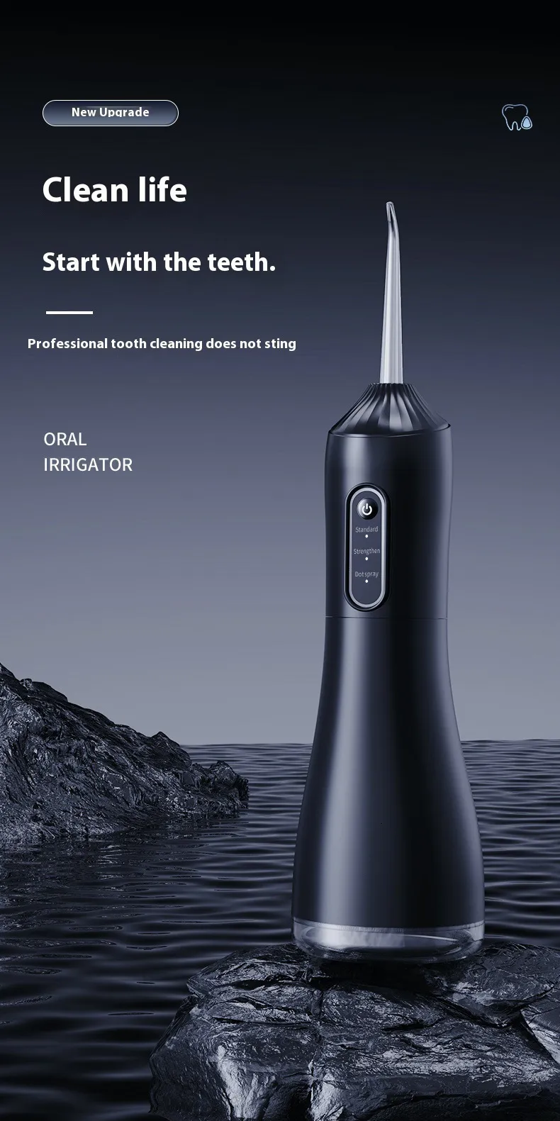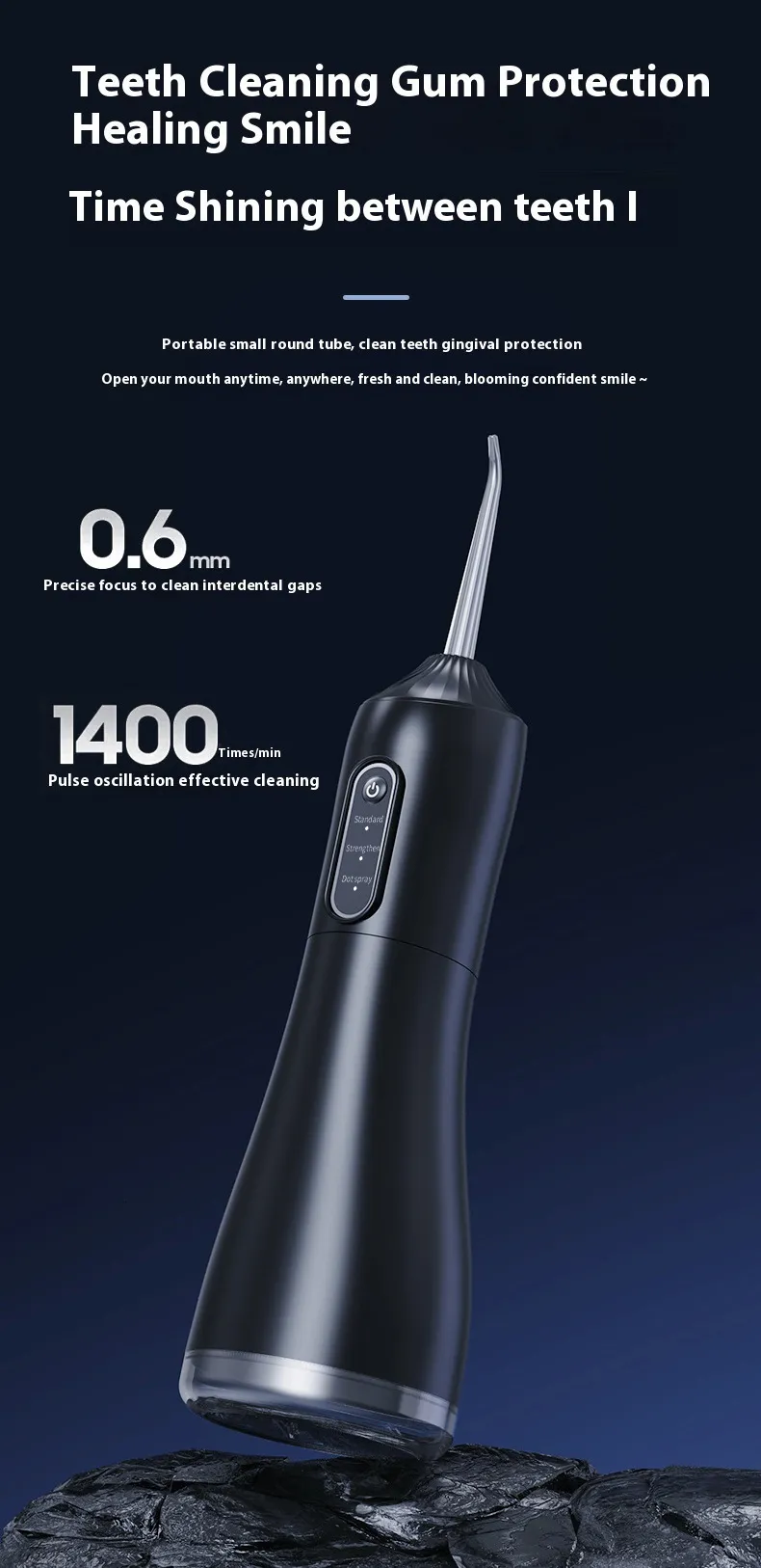 Rated Voltage:3.7V Rated Power:5W Waterproof Grade:IPX7 Level Charging Time:2H Pulse Frequency:1400 times/min Material:ABS Color:Black,Purple,White Size:15.5x7x7cm Water Tank Volume:330ml Category:Oral Hygiene ..