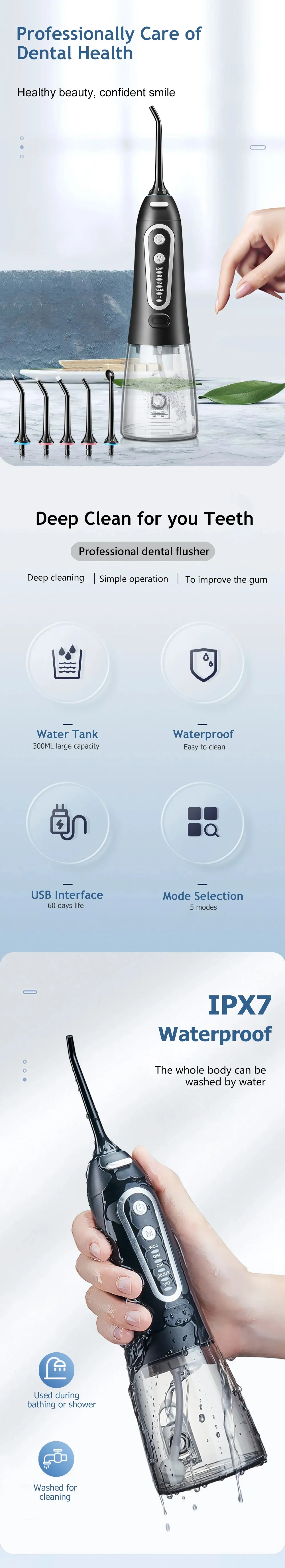 Oral Irrigator USB Rechargeable Water Flosser Portable Dental Water Jet 300ML Water Tank Waterproof Teeth Cleaner For Oral Care